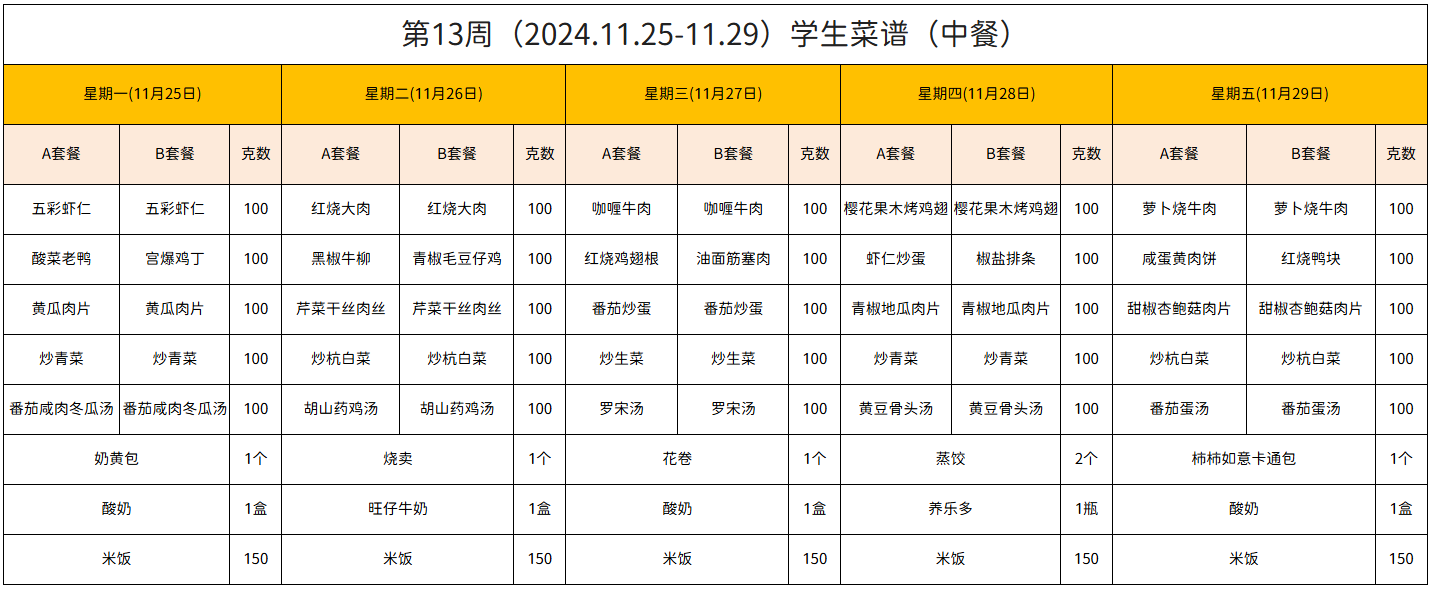 第13周(2024.11.25-11.29)学生菜谱(中餐)