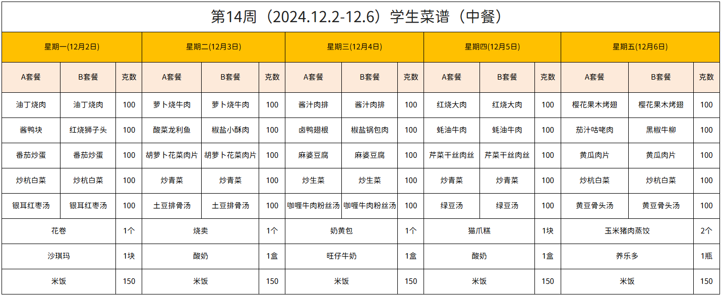 第14周(2024.12.2-12.6)学生菜谱(中餐)
