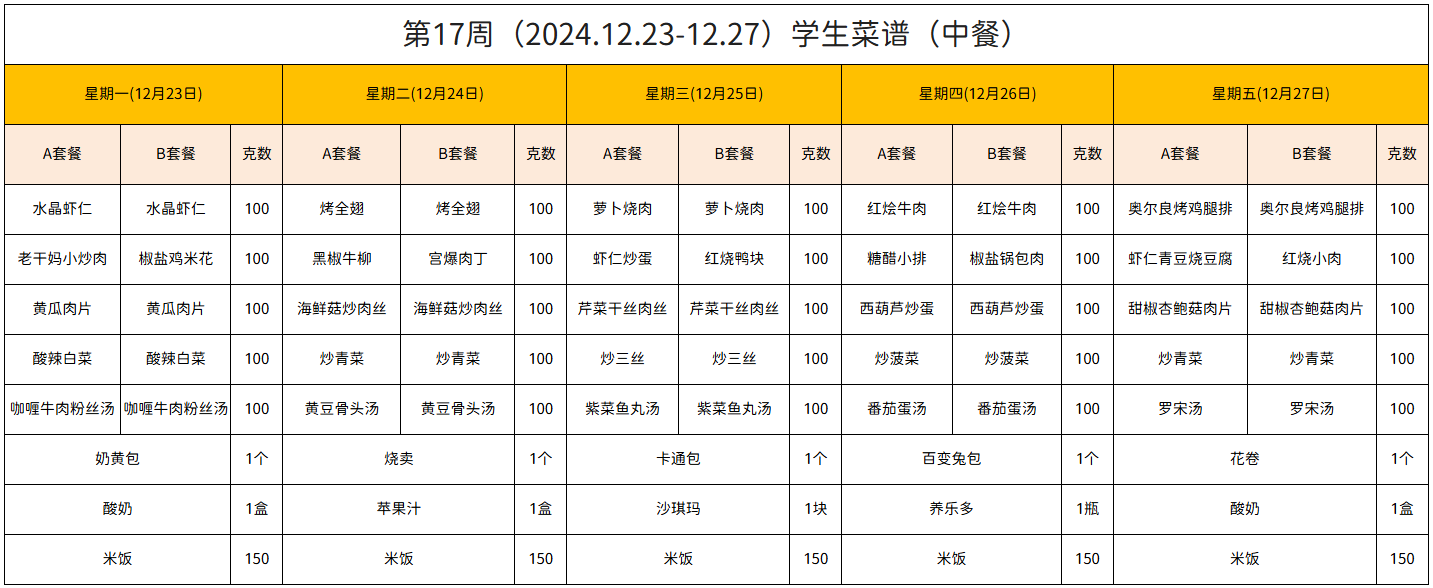 第17周(2024.12.23-12.27)学生菜谱(中餐)