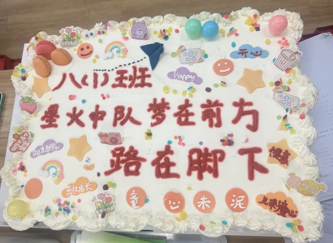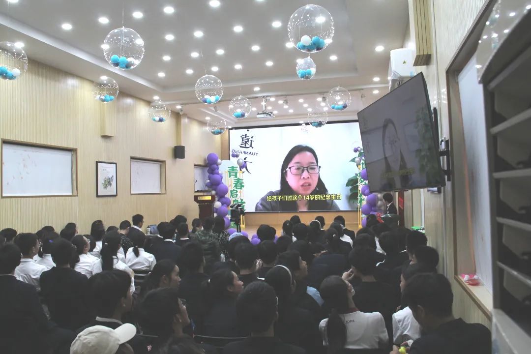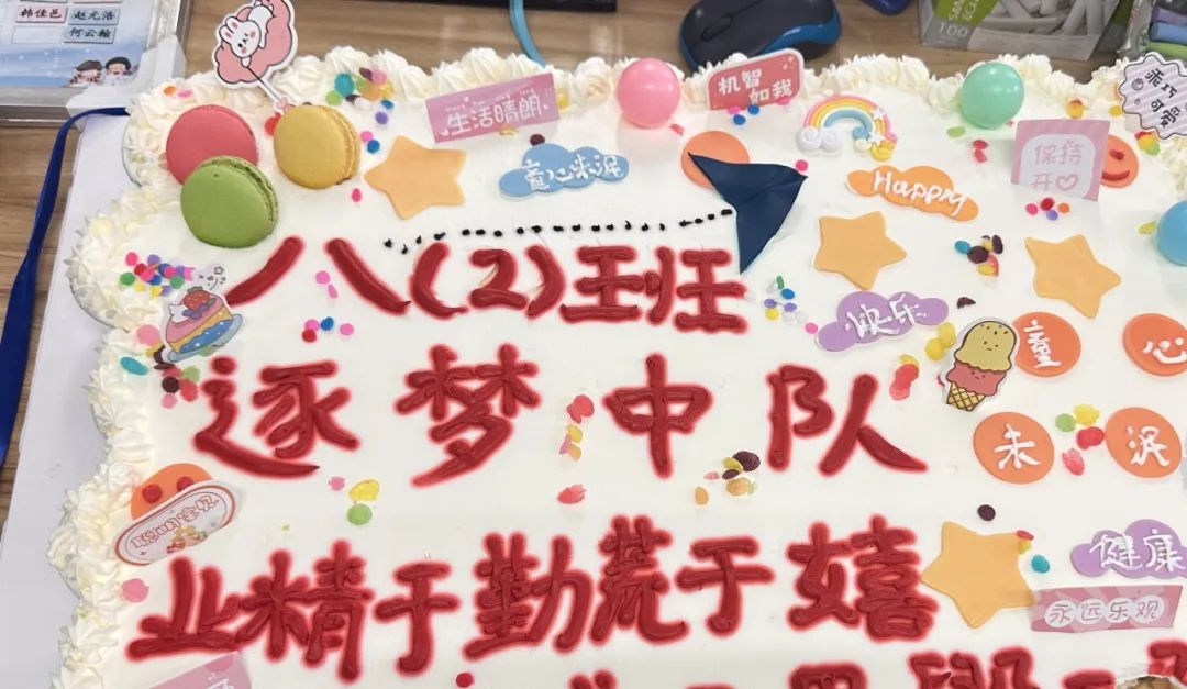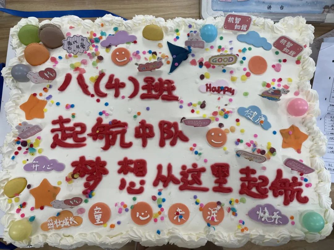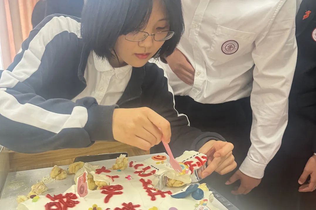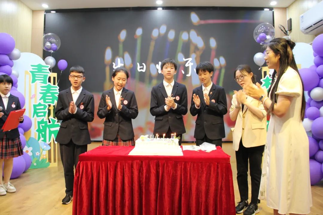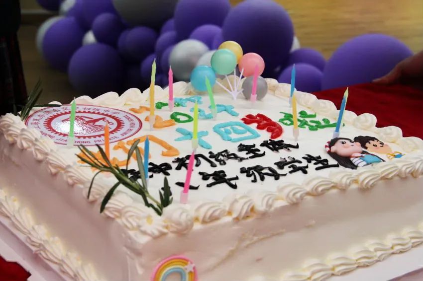 在这个特殊的日子里,学校为同学们准备了仪式大蛋糕,全体师生共同唱响生日歌,切开生日蛋糕,为美好的十四岁送上最真挚的祝福。