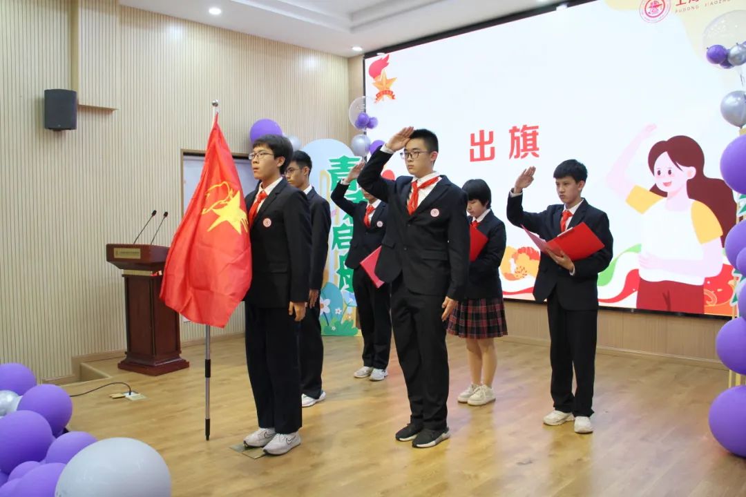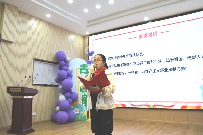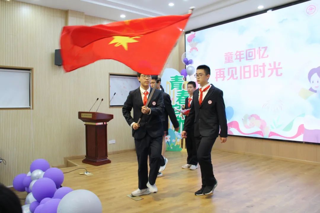 伴随着庄重的乐声,护旗手高举少先队队旗缓缓走上舞台,全体少先队员齐唱中国少年先锋队队歌,歌声嘹亮,回响在校园的每一个角落。